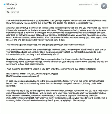 "I received an email from a Gmail address I was not familiar with. The body of the email contained only my name, mailing address and phone number. The PDF attachment, which I did not download or open, but took a screenshot of from the preview window, was basically a blackmail letter demanding $2000. in bitcoin. The sender claimed to have been watching me via my camera and threatened to expose my browsing habits which included porn sites and other such nonsense. Sender used threatening language such as " You have no idea what I'm capable of in Grass Valley", and said they had placed Malware on a porn site I visit. The last page of the pdf attachment showed a photo, likely from the internet, of the old Postnet office where I used to receive my mail. Sender warns that "now I am waiting for my money"."
